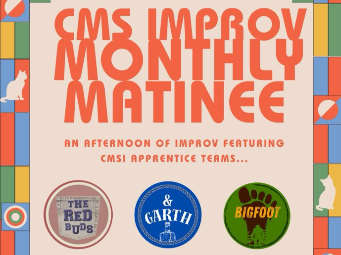Join us on the LAST SATURDAY at 4pm for the Monthly Matinee featuring CMS Improv Apprentice Teams THE RED BUDS, & GARTH, and BIGFOOT!